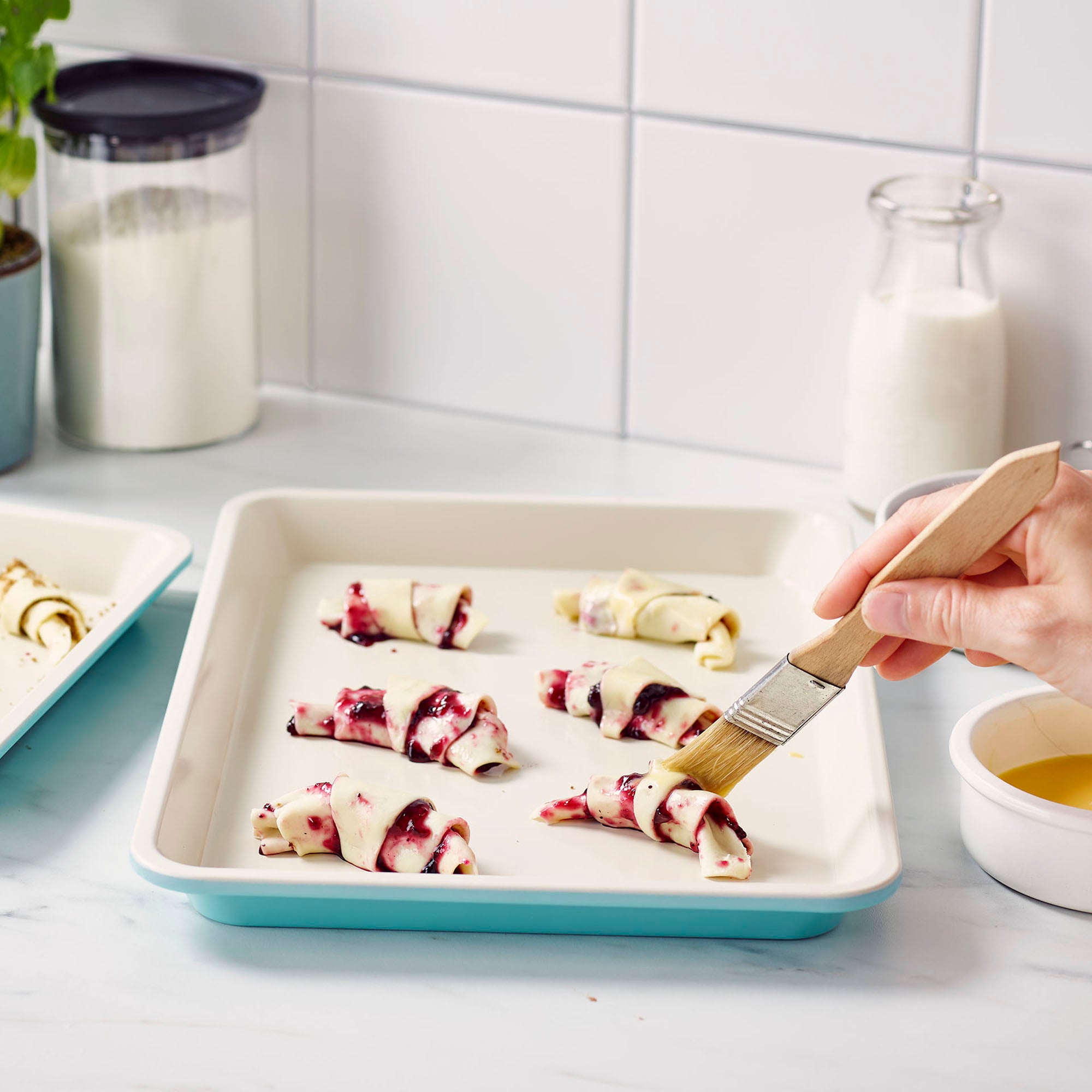 With a healthy ceramic nonstick coating, even the stickiest foods slide off easily—no greasing, cooking spray, or parchment paper required. Made of heavy-duty steel for quick and even heating, our pans are built to last through countless baking sessions. And the icing on the cake (or cookie)? The bright colors make baking more fun and relaxing than ever.