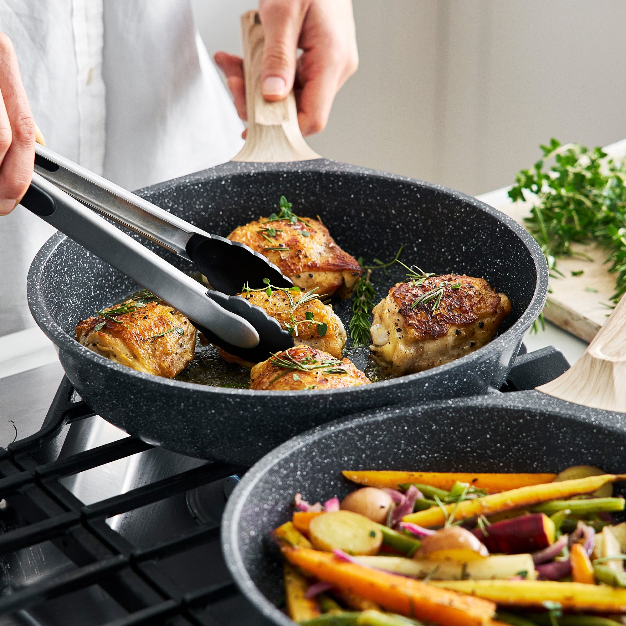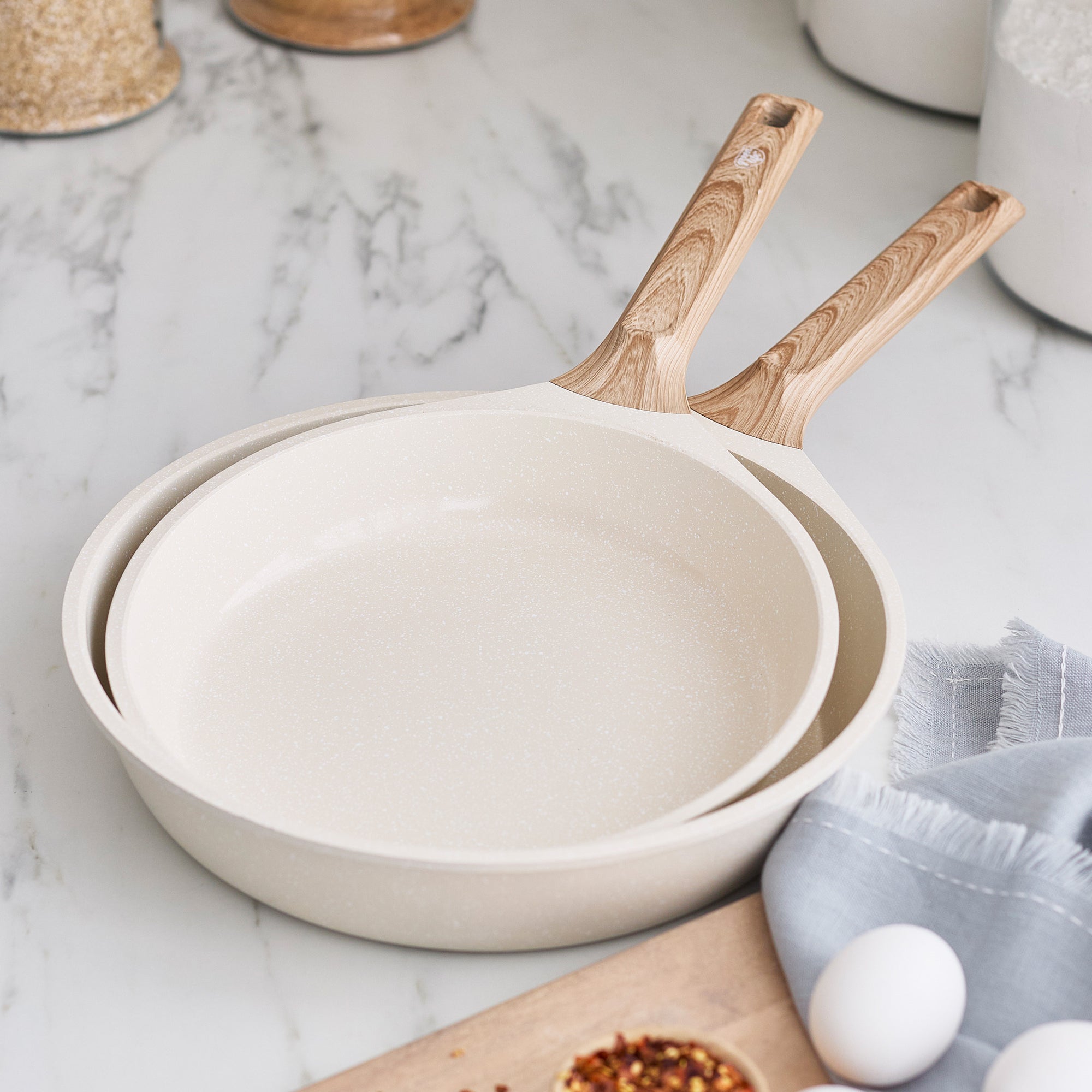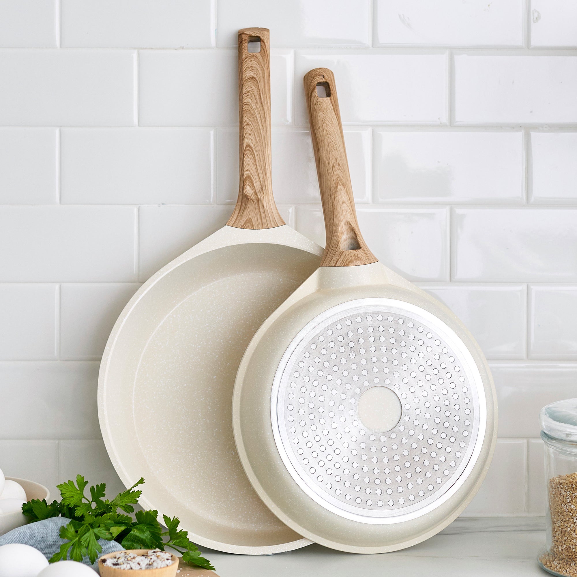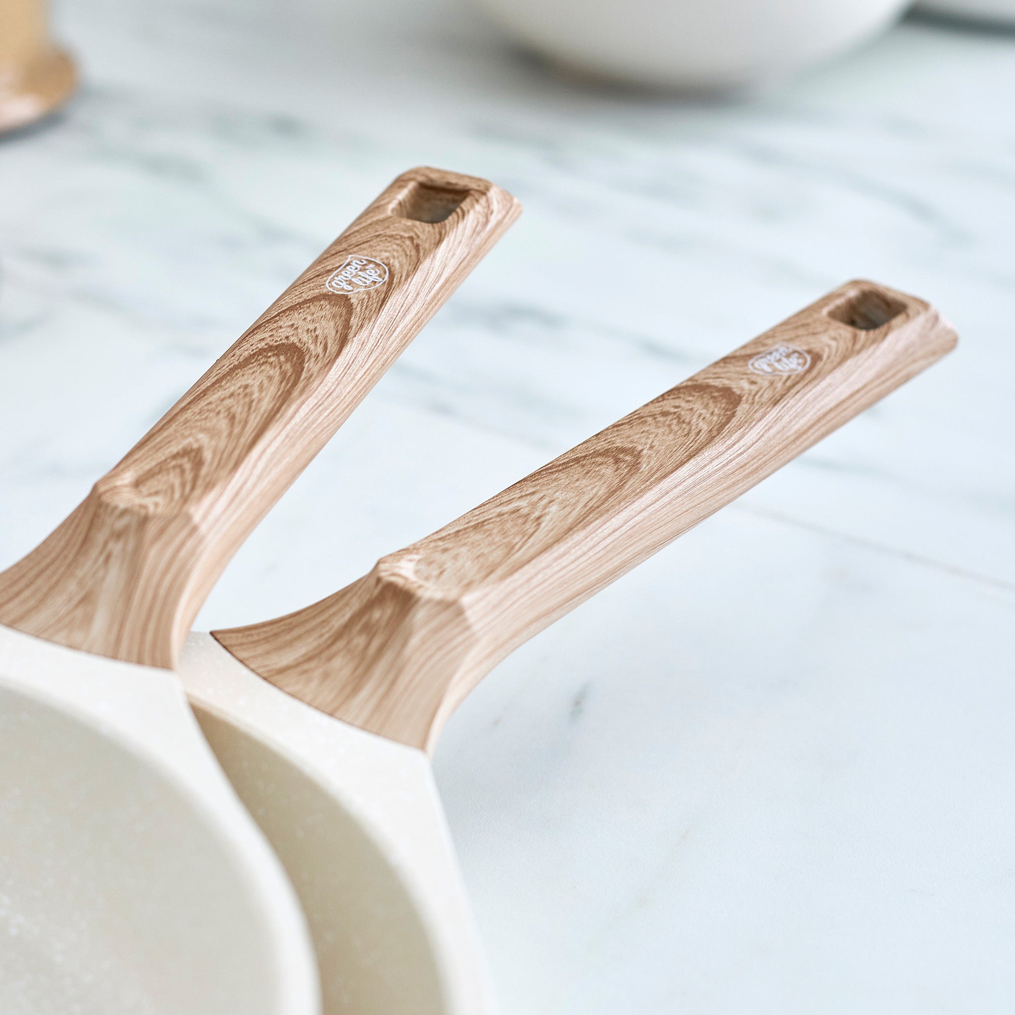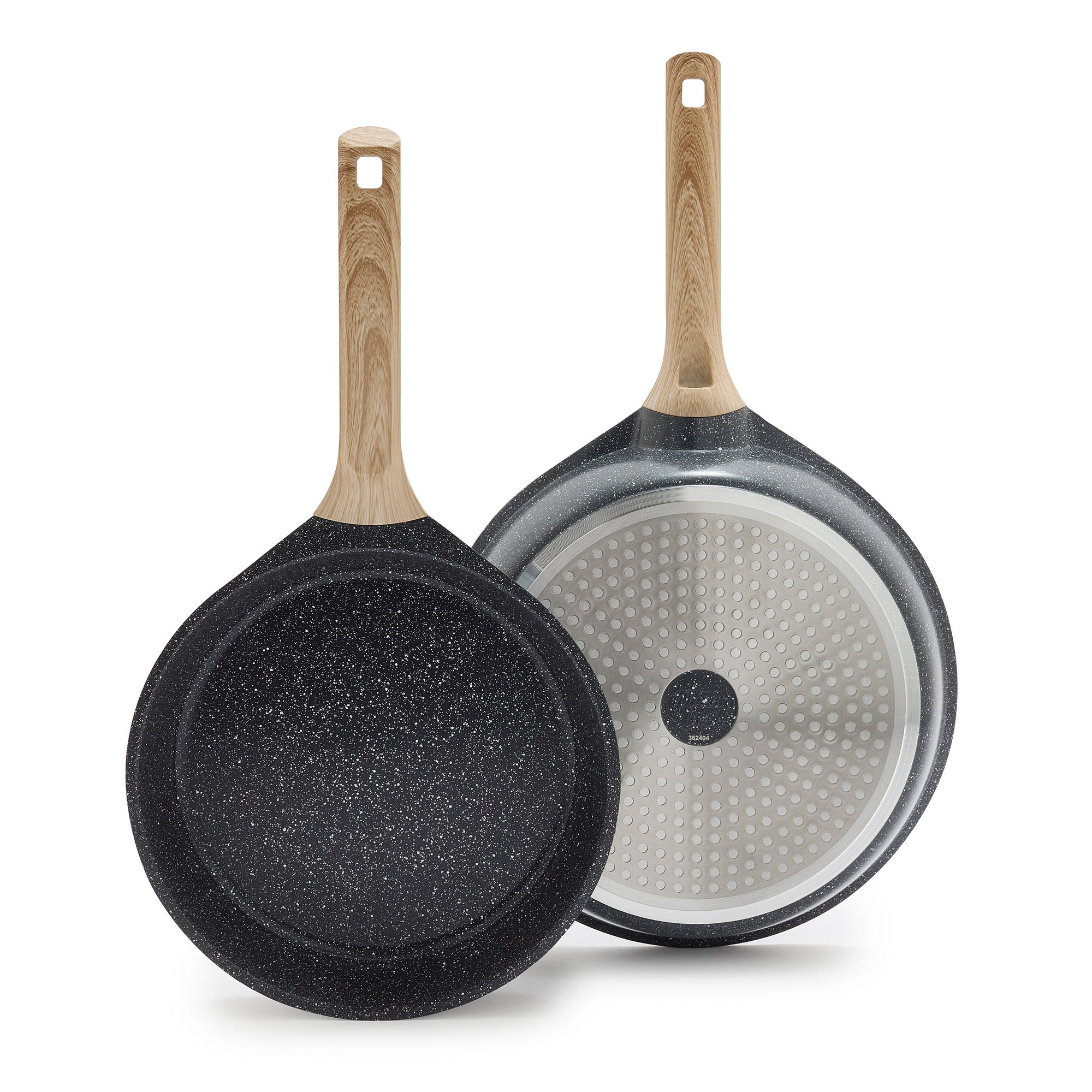 Designed for both durability and versatility, these pans are constructed from sturdy die-cast aluminum and feature an innovative induction base for uniform heat distribution on all cooktops: induction, gas, electric, halogen or ceramic. The vintage wood-print handles keep your comfortable while you cook while adding a timeless style to your space. Simply wipe messes away thanks to our easy-release ceramic nonstick coating or toss these pans in the dishwasher for even easier cleaning.