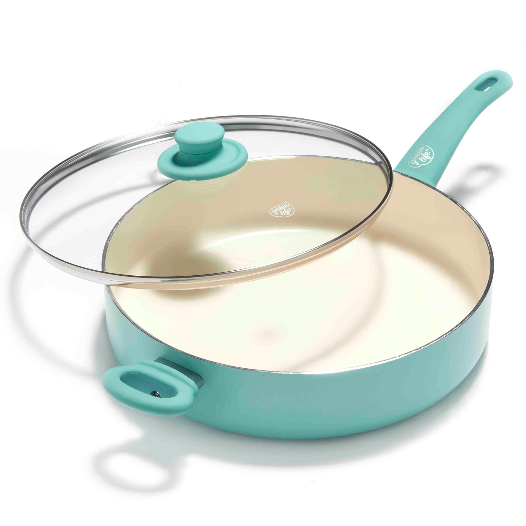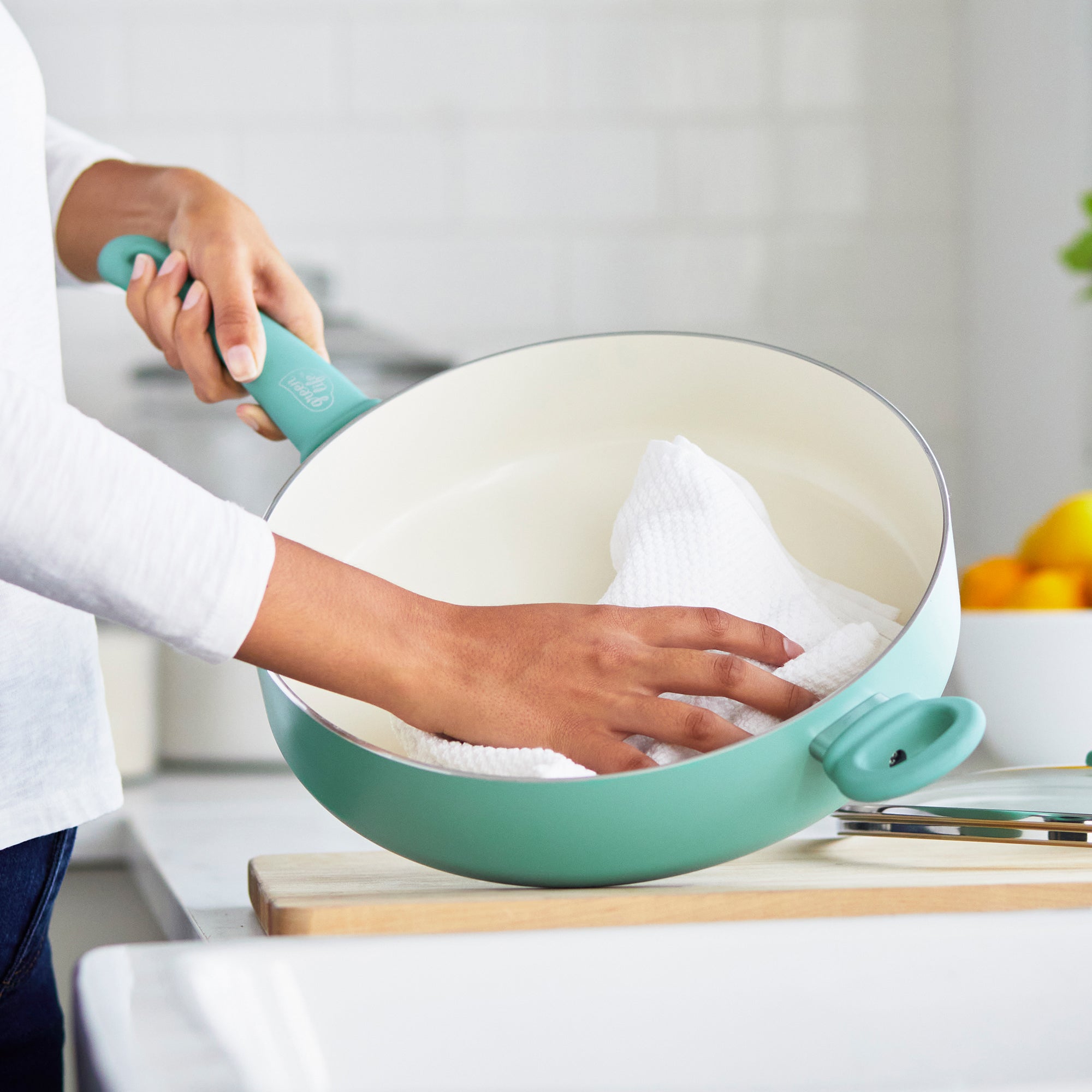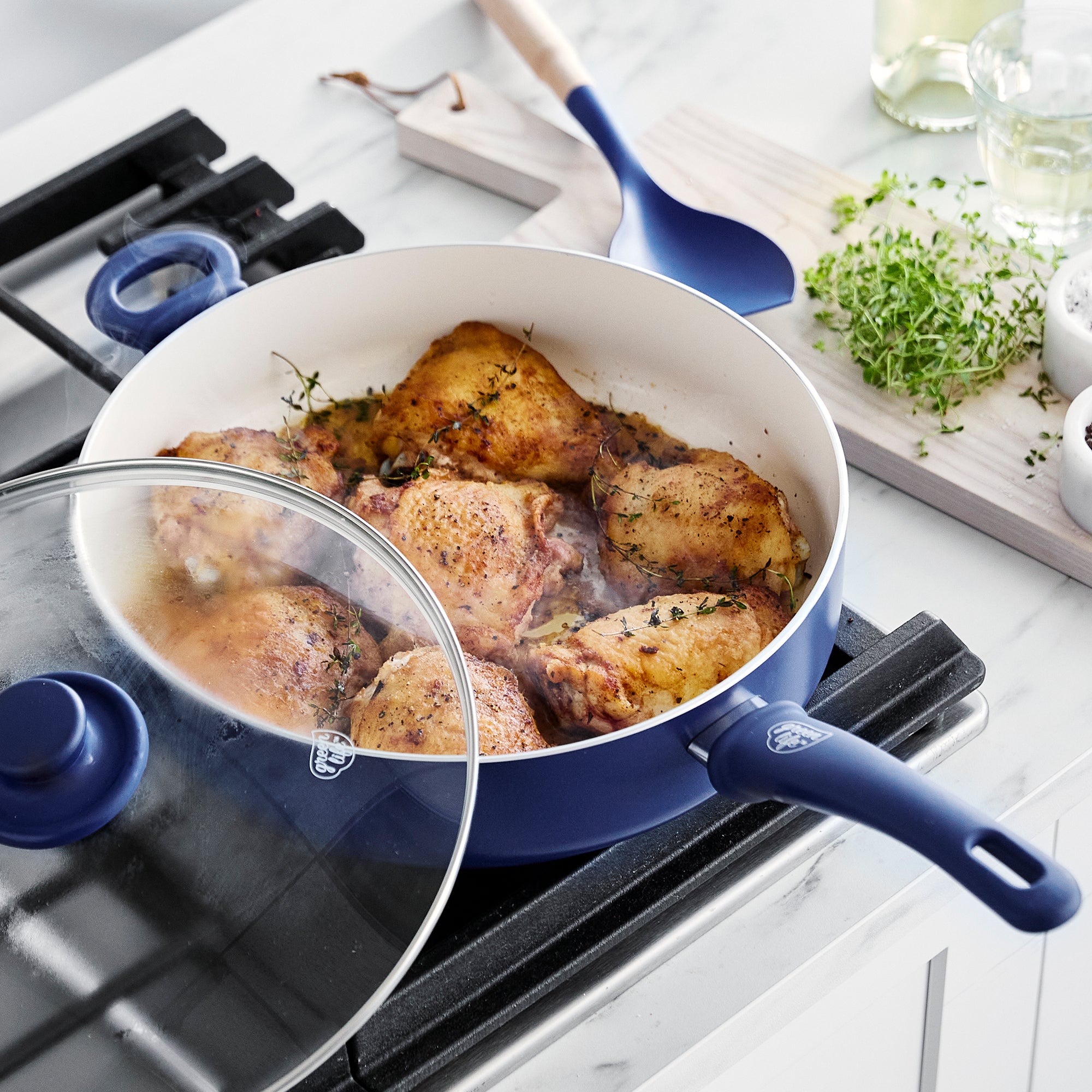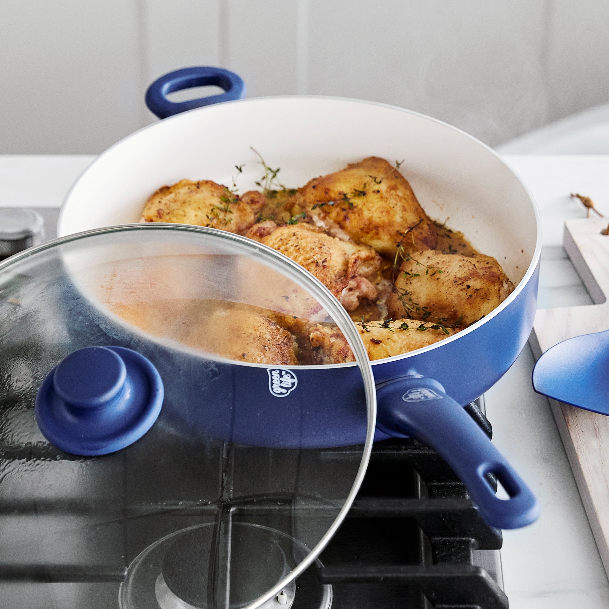 Meet your new go-to favorite for everything from sautéing and searing to frying and braising. A wide cooking surface makes this multitasker ideal for one-pan meals, while the clear glass lid locks in moisture and lets you monitor food as it cooks. Plus, the fun turquoise color might just make kitchen time feel like a day at the beach.