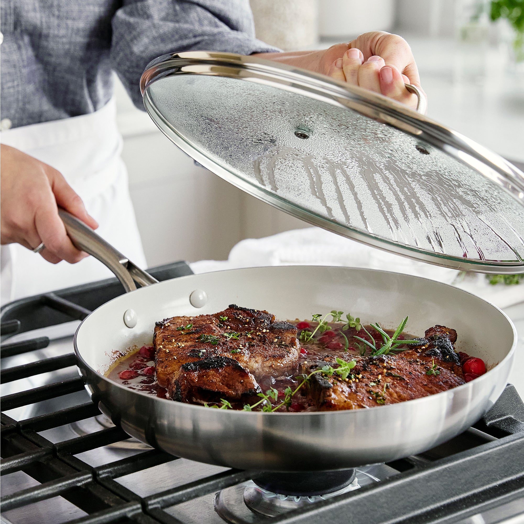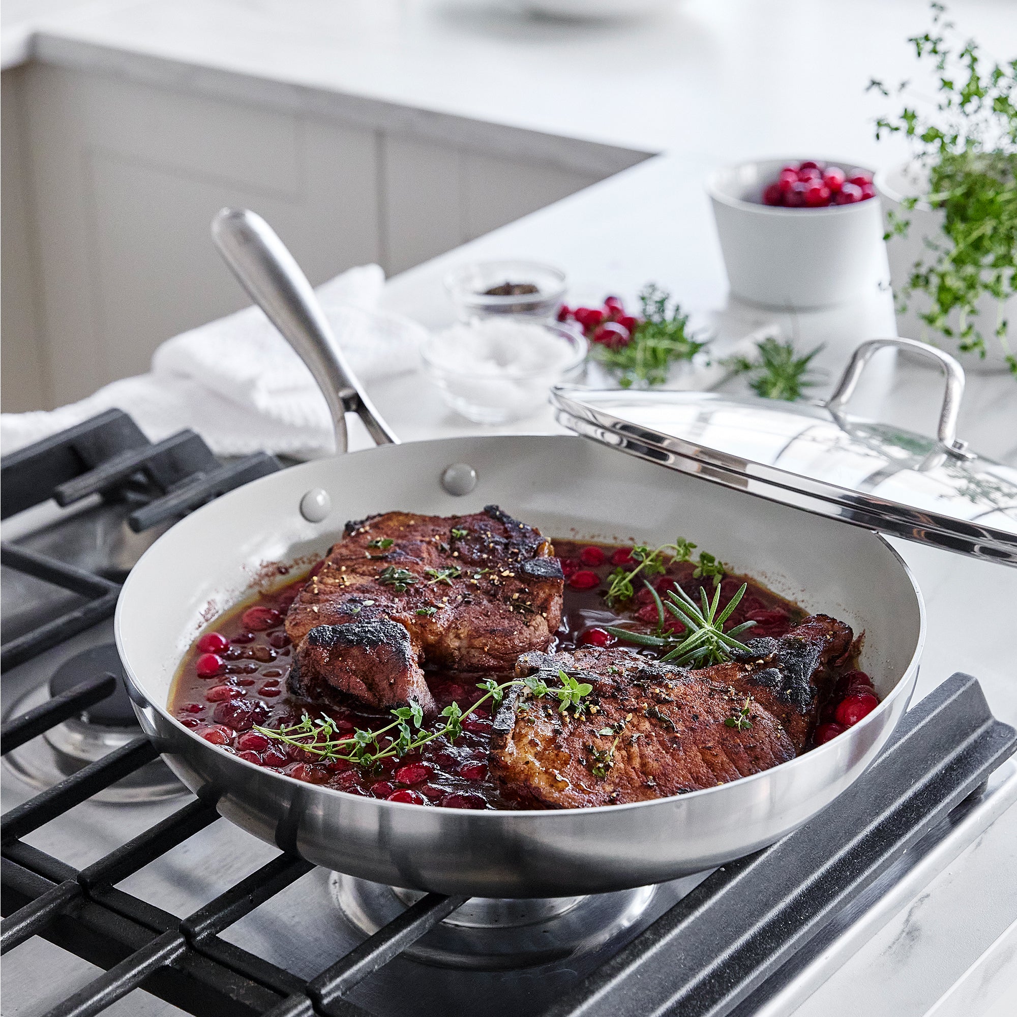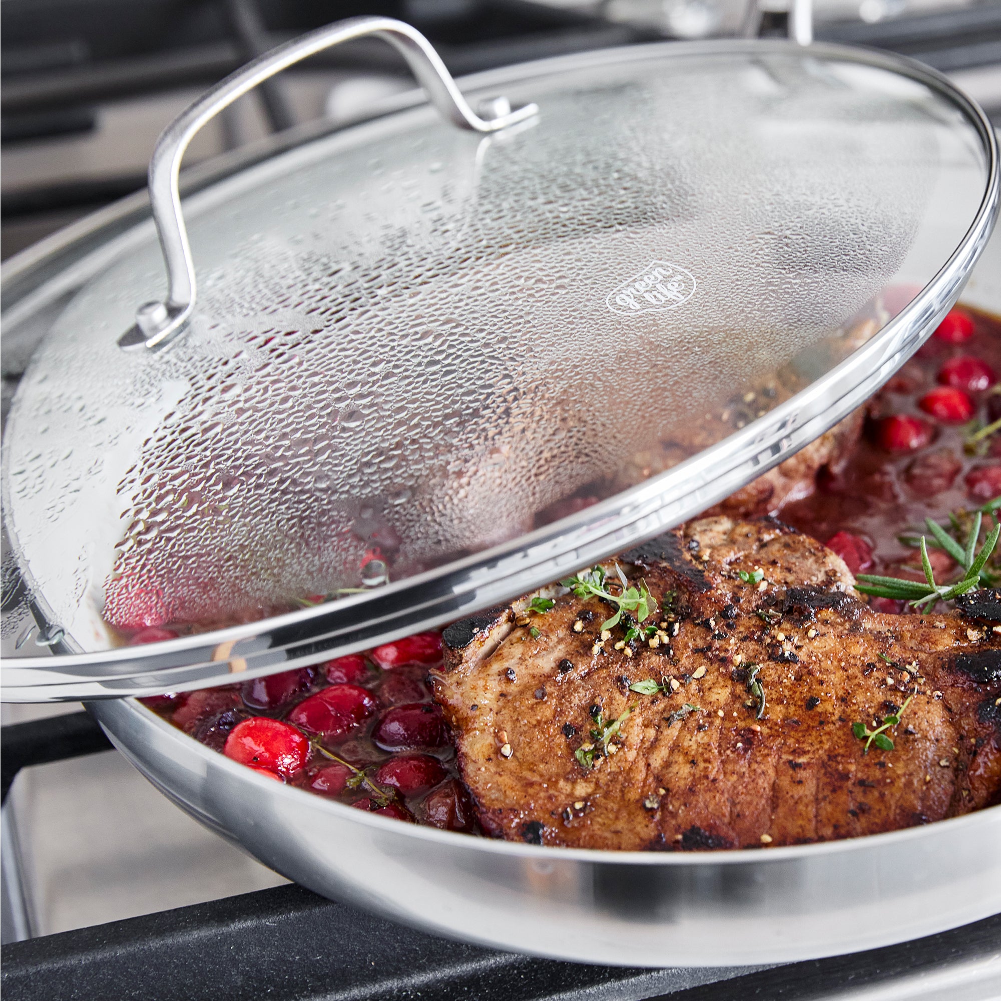 We’re breaking new ground with this 3-ply stainless steel collection. Featuring two layers of stainless steel surround an aluminum core, this collection heats quickly, evenly, and performs as good as it looks. With plenty of room for thick cuts of meat and one-pan meals, this 12” frying pan is built for daily life. Plus, the durable glass lid will make sure this is your go-to pan for everything.