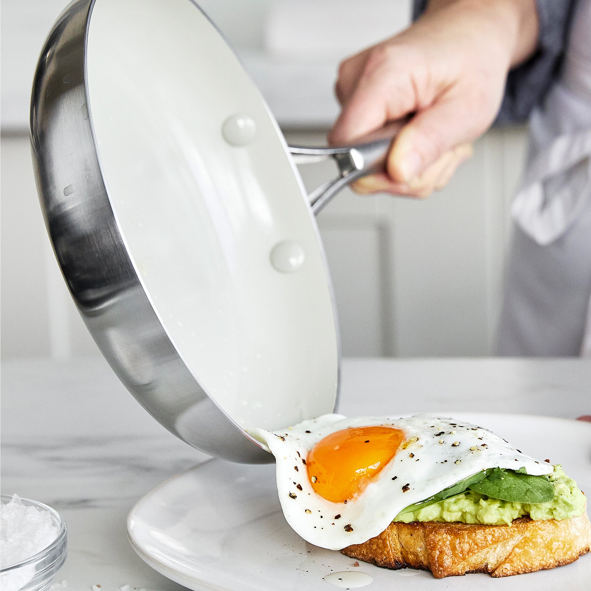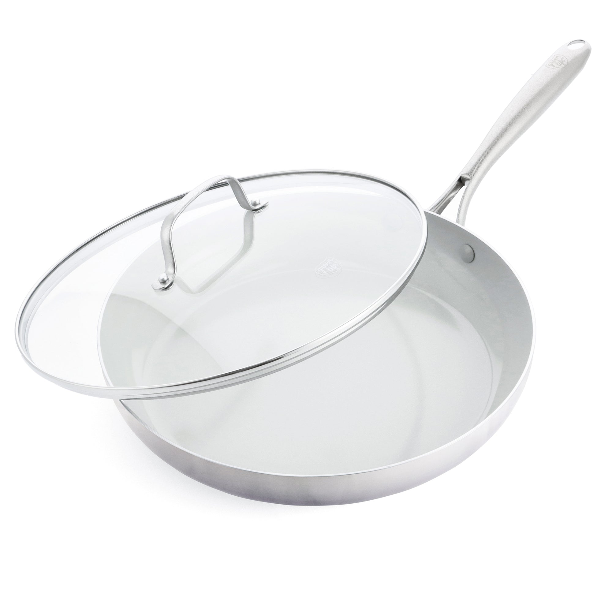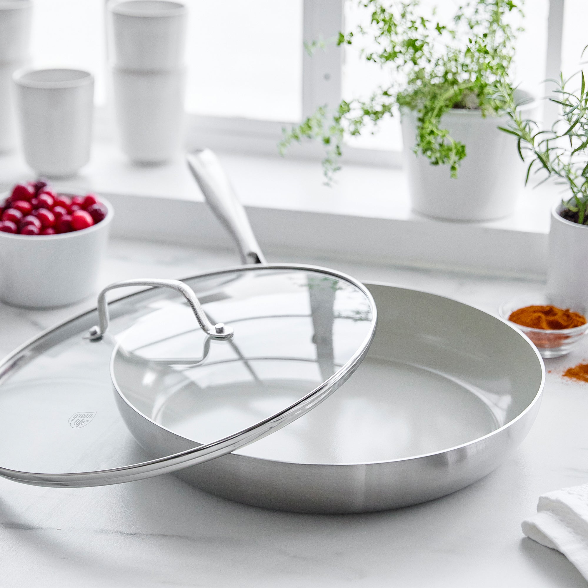 We’re breaking new ground with this 3-ply stainless steel collection. Featuring two layers of stainless steel surround an aluminum core, this collection heats quickly, evenly, and performs as good as it looks. With plenty of room for thick cuts of meat and one-pan meals, this 12” frying pan is built for daily life. Plus, the durable glass lid will make sure this is your go-to pan for everything.
